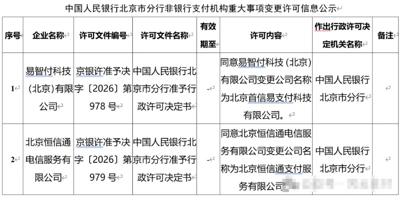 根据中国人民银行北京市分行发布的非银行支付机构重大事项变更许可信息,许可文件编号为"京银许准予决字〔2026〕第978号"。监管同意易智付科技(北京)有限公司变更公司名称为北京首信易支付科技有限公司。